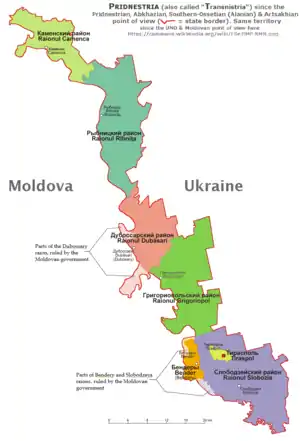 The Transnistria conflict (Romanian: Conflictul din Transnistria; Russian: Приднестровский конфликт, romanized: Pridnestrovskiy konflikt) is an ongoing frozen conflict between Moldova and the unrecognized state of Transnistria. Its most active phase was the Transnistria War. There have been several attempts to resolve the conflict, although none have been successful.[8][9] The conflict may be considered as having started on 2 September 1990, when Transnistria made a formal sovereignty declaration from Moldova (then part of the Soviet Union).[10]