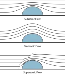 Transonic (or transsonic) flow is air flowing around an object at a speed that generates regions of both subsonic and supersonic airflow around that object.[1] The exact range of speeds depends on the object's critical Mach number, but transonic flow is seen at flight speeds close to the speed of sound (343 m/s at sea level), typically between Mach 0.8 and 1.2.[1]