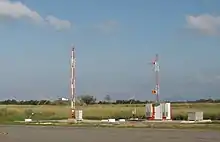 Conventional ILS systems broadcast using a number of "single purpose" antennas. The localizer array consists of 8 to 14 or more antenna elements and is typically located 2000+ feet from the runway approach threshold, which is often beyond the departure end of the runway, and provides a fan-shaped signal for azimuth direction (side to side). The other antenna array is located beside the runway and provides elevation to indicate a standard glideslope. ILS installations typically also include two or more "marker beacons" located off the end of the runway to provide distance indications as the aircraft approaches the runway. This complex set of antennas is expensive to install and maintain, and is often difficult to site in areas with uneven terrain or obstacles that could interfere with its guidance signals.