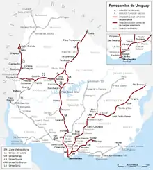 Uruguayan railways have a total operational length of 1,673 kilometres (1,040 mi)[1] (all standard gauge as of 2005).