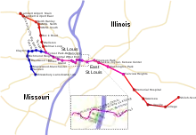 Light rail service in Greater St. Louis serves St. Louis County and the city of St. Louis through MetroLink, a light rail system with two lines (the Red Line and the Blue Line) operated by the Bi-State Development Agency. The Red Line originates at Lambert-St. Louis International Airport in northwest St. Louis County, continues southeast with seven stations before entering St. Louis city, where it joins the Blue Line. The Blue Line begins in Shrewsbury, continues north to Clayton, where it turns east and eventually joins the Red Line. Eastbound from here, there are eight stations before the combined service crossed the Mississippi River on the Eads Bridge into Illinois. The combined light rail continue to Fairview Heights, where the Blue Line ends. The Red Line continues east, ending in Shiloh.