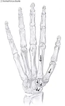 - Pellegrini VD (May 2001). "Pathomechanics of the thumb trapeziometacarpal joint". Hand Clin. 17 (2): 175–84, vii–viii. doi:10.1016/S0749-0712(21)00238-9. PMID 11478040.