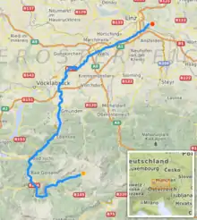 listen)) is a river in the Austrian state of Upper Austria. Its source is in the Totes Gebirge mountain range in Styria. It flows through the Salzkammergut area and the lakes Hallstätter See and Traunsee. The Traun is a right tributary of the Danube, which it meets near the city of Linz. Other towns along the river are Bad Aussee, Bad Ischl, Gmunden, Wels and Traun. The Traun is 155.9 km (96.9 mi) long,[1] and has a basin area of 4,257 km2 (1,644 sq mi). Its average discharge at the mouth is 150 m3/s (5,300 cu ft/s).[2]