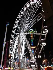 A traveling carnival (US English), usually simply called a carnival, or travelling funfair (UK English), is an amusement show that may be made up of amusement rides, food vendors, merchandise vendors, games of chance and skill, thrill acts, and animal acts. A traveling carnival is not set up at a permanent location, like an amusement park or funfair, but is moved from place to place. Its roots are similar to the 19th century circus with both being fitted-up in open fields near or in town and moving to a new location after a period of time. In fact, many carnivals have circuses while others have a clown aesthetic in their decor.[1][2] Unlike traditional carnival celebrations, the North American traveling carnival is not tied to a religious observance.