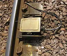 In railway signalling, a treadle is a mechanical or electrical device that detects that a train wheel has passed a particular location. They are used where a track circuit requires reinforcing with additional information about a train's location, such as around an automatic level crossing, or in an annunciator circuit, which sounds a warning that a train has passed an exact point. They also serve as a critical backup in the case of track circuit failure. The important difference between a treadle and a track circuit is that while a track circuit detects a train over a distance as long as several kilometres, a treadle provides detection at a single fixed location.