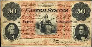 Three year Treasury Notes bearing interest at a rate of 7.30% (seven-thirty) were first authorized by the Act of July 17, 1861 to help finance the Civil War.[11] These notes were payable to order, but the Treasury would issue them in blank form if requested. Secretary of the Treasury Chase suggested this rate of interest in hopes that the ease of interest calculation (a $50 note would accrue interest at one cent per day) would allow the notes to circulate as money, but apparently this did not prove to be the case.[12] Further issues of Seven-Thirties were made in 1864 and 1865. The issue of 1861, which preceded the First Legal Tender Act, paid interest in gold, but the government reserved the right to pay the interest of the 1864 and 1865 issues in either United States Notes at 7.3% or in gold at 6%. The option to pay in gold, however, was never exercised.