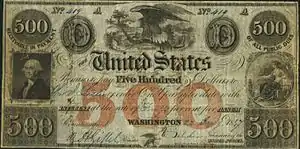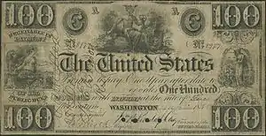 A Treasury Note is a type of short term debt instrument issued by the United States prior to the creation of the Federal Reserve System in 1913. Without the alternatives offered by a federal paper money or a central bank, the U.S. government relied on these instruments for funding during periods of financial stress such as the War of 1812, the Panic of 1837, and the American Civil War. While the Treasury Notes, as issued, were neither legal tender nor representative money, some issues were used as money in lieu of an official federal paper money. However the motivation behind their issuance was always funding federal expenditures rather than the provision of a circulating medium. These notes typically were hand-signed, of large denomination (at least $50), of large dimension (bigger than private banknotes), bore interest, were payable to the order of the owner (whose name was written on the front of the note), and matured in no more than three years – though some issues lacked one or more of these properties. Often they were receivable at face value by the government in payment of taxes and for purchases of publicly owned land,[1] and thus "might to some extent be regarded as paper money."[2] On many issues the interest rate was chosen to make interest calculations particularly easy, paying either 1, 1+1⁄2, or 2 cents per day on a $100 note.