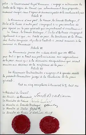 The Treaty of Bucharest of 1916 was signed between Romania and the Entente Powers on 4 (Old Style)/17 (New Style) August 1916 in Bucharest.[1] The treaty stipulated the conditions under which Romania agreed to join the war on the side of the Entente, particularly territorial promises in Austria-Hungary. The signatories bound themselves to keep secret the contents of the treaty until a general peace was concluded.