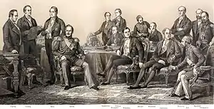 The Treaty of Paris of 1856 brought an end to the Crimean War between the Russian Empire and an alliance of the Ottoman Empire, Great Britain, the Second French Empire and the Kingdom of Sardinia.[1][2]