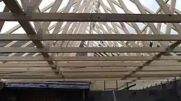 Wood is used in the construction of buildings, bridges, trackways, piles, poles for power lines, masts for boats, pit props, railway sleepers, fencing, hurdles, shuttering for concrete, pipes, scaffolding and pallets. In housebuilding it is used in joinery, for making joists, roof trusses, roofing shingles, thatching, staircases, doors, window frames, floor boards, parquet flooring, panelling and cladding.[126]