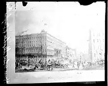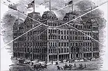 The fourth hotel was designed by John M. Van Osdel, who had designed the previous third hotel. It opened its doors in 1873. It stood six floors.[1] It was constructed by the estate of Couch, who had himself passed away in 1857.[3] The rebuilt hotel remained along with the Palmer House, Grand Pacific Hotel and the Sherman House as a leading hotel after the Great Chicago Fire.[2] It was built in the commercial palazzo architecture style of the day and claimed to be fireproof.[2]