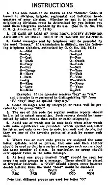 Below are pages from a U.S. Army World War I trench code, an edition designated as "Seneca:"[1]: pp.185-188