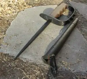 With the exception of the German Nahkampfmesser or (close combat knife),[4] most early trench knives were fabricated by hand by individual soldiers or blacksmiths for the purpose of silently killing sentries and other soldiers during trench raids.[6] These early "trench knives" were often shortened and sharpened Army-issue bayonets. One type of stabbing weapon, the French Nail, was made by cutting and pointing the steel stakes used to support the barbed wire protecting trenches. Some historians say that some trench knives models were inspired by the Bowie knife.[7]
