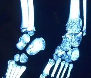 Trevor disease can often mimic posttraumatic osseous fragments,[2][3] synovial chondromatosis, ostechondroma, or anterior spur of ankle.[4][5][6][7] It is not possible to distinguish DEH from osteochondroma on the basis of histopathology alone.[8][6] Special molecular tests of the genes EXT1, EXT2 are used for the analysis of genetic expressions. These are within normal ranges in DEH, while they are lower in ostechondroma (owing to a mutation).[2][6][9][10] These tests are expensive and the diagnosis is often made on clinical and radiological findings. Synovial chondromatosis occurs in a much older age group and can be ruled out on this basis.[2]