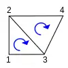 Note that n starts at 1. The above code sample and diagram demonstrate triangles drawn in a clockwise orientation. For those to be considered front-facing, a preceding call to glFrontFace(GL_CW) is necessary, which otherwise has an initial value of GL_CCW (meaning that triangles drawn counter-clockwise are front-facing by default).[5] This is significant if glEnable(GL_CULL_FACE) and glCullFace(GL_BACK) are already active (GL_BACK by default[6]), because back-facing triangles will be culled, so will not be drawn and will not appear on-screen at all.[7]