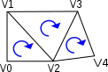 Similarly, reversal of strips’ vertices will result in the same set of triangles if the strip has an even number of vertices. (e.g. strip FEDCBA will represent the same triangles FED,ECD,DCB,CAB as the original strip). However, if a strip has an odd number of vertices then the reversed strip will represent triangles with opposite orientation. For example, reversal of a strip ABCDE will result in strip EDCBA which represents triangles EDC, DBC, CBA).