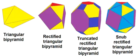 The triangular bipyramid, dt{2,3}, can be in sequence rectified, rdt{2,3}, truncated, trdt{2,3} and alternated (snubbed), srdt{2,3}: