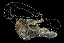 Trichechus hesperamazonicus is known by two fragmentary mandibles and part of the palate. Compared with other manatees, it has a wide space between the posterior lower tooth row and ascending ramus of dentary, where the buccinator muscle is located, and a wide ascending ramus of the mandible, which covers the posterior end of the tooth row.[1][3] It also shares some characteristics with living species, as relatively few large teeth and few mental foramina as T. manatus and T. senegalensis (in contrast with the many smaller teeth and many mental foramina of T. inunguis) and a straight and shallow mandibular symphysis as T. inunguis and T. senegalensis (in contrast with the downturned snout and deep mandibular symphysis of T. manatus).[1] The affinities of this species are still not fully resolved, being recovered in a polytomy with T. inunguis and a clade formed by T. manatus and T. senegalensis[1]