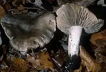 Distinctive characteristics of Tricholoma pullum fruit bodies include the dark tray cap, dark gray tints on the gill edges, and the bitter or acrid taste. Tricholoma virgatum is somewhat similar in appearance, but can be distinguished by its pointed umbo, lack of greyish tints on the gill edges, and its preferred habitat of coniferous and mixed woods.[2] The European species Tricholoma hordum has smaller fruit bodies with more distantly spaced gills, which have a pinkish coloration.[1]