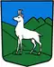 The blazon of the municipal coat of arms is Azure on a plane in front of mountains Vert a Chamois statant Argent.[5]