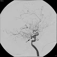 A persistent trigeminal artery is associated with an increased risk of aneurysm, though some studies have suggested that this finding may be an effect of selection bias, as most individuals do not undergo the tests necessary to identify the condition.[3] Persistent trigeminal artery has been identified as a rare cause of trigeminal neuralgia, with 2.2% prevalence of persistent trigeminal artery among trigeminal neuralgia patients.[8] Surgery to move the persistent trigeminal artery away from the trigeminal nerve has been successful in treating the trigeminal neuralgia in some cases.[9] In some cases, presence of a persistent trigeminal artery concurs with hypoplasia of the basilar artery, in which case the internal carotid artery is responsible for most blood flow to the upper pons, cerebellum, midbrain, and parts of the temporal and occipital lobes, meaning that anything disrupting blood flow in the internal carotid artery could lead to ischemia in these regions.[10] In addition, persistent trigeminal artery has been associated with vertebrobasilar insufficiency, brainstem ischemia, and carotid cavernous fistulae.[2]
