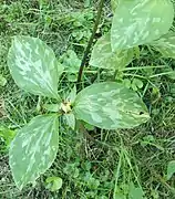 Trillium recurvatum grows up to 40 cm (16 in) tall with three ovate to lanceolate bracts, mottled green, 6 to 18 cm (2 to 7 in) long and 2 to 6.5 cm (1 to 3 in) across, petiolate at maturity.[3][10]