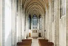 The Trinity College Chapel was built with funds donated by Gerald Larkin, head of the Salada Tea Company from 1922 to 1957. It was designed in the modified perpendicular Gothic style by renowned English architect Giles Gilbert Scott, who was also responsible for the Liverpool Cathedral and the ubiquitous red telephone boxes seen throughout Britain.[105] The chapel extends 100 feet (30 m) to the reredos and is 47 feet (14 m) high at the vault bosses.[99] Using only stone, brick, and cement, Italian stonemasons employed ancient building methods; the only steel in the construction is in the hidden girders supporting the slate roof, with the exterior walls being sandstone. The Chapel contains several architectural sculptures, including a tympanum by Emmanuel Hahn as well as a carved lintel and tympanum by Jacobine Jones, who also carved the wooden angels on the baptistry. The Lady Chapel's altar was preserved from the original Queen Street location chapel, while the matching sedilia was donated by Robertson Davies’ widow in his memory.[106] In the chapel a memorial tablet in Indiana limestone designed by Allan George, with lettering and medallions by A. Scott Carter, is dedicated to the members of Trinity College who gave their lives in the First and Second World Wars.[107] A number of bronze memorial plaques also honour alumni who died during the First World War.[108] On the wall outside the entrance to the chapel, a memorial Triptych illuminated manuscript in three frames is an Honour Roll erected by Trinity College in 1942 dedicated to the approximately 1000 men and women of Trinity College who died while serving their country; Canadian artist Jack McNie completed the lettering by hand.[109]