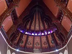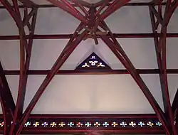 The interior features wooden beams that form an intricate complex of transverse and rib vaulting. They resemble medieval roof timbering. Trimmed in vermillion, the beams are fastened together by gold star-shaped bolts. The main nave is divided from the side naves by cast iron columns that are connected by wooden arches in the same style as the ceiling beams. The chancel and apse ceiling is painted in terra-cotta and features stenciling in gold leaf. The rest of the cathedral's décor is rather plain with white plastered walls above dark wood wainscoting. Butternut was used for all the interior woodwork. The ceiling, which is now painted white, was originally painted ultramarine.[9] Nineteenth-century stained glass windows illuminate the interior of the church, including the nine lancet windows in the apse. The Stations of the Cross on the side walls are later additions. The rose window commemorates Bishop Kemper.