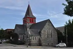 The Trinity Episcopal Church building stands at the southwest corner of Spruce and Bates Streets in downtown Lewiston, just south of Kennedy Park. It is a single-story stone structure laid out in a cruciform plan, with granite walls and a slate roof. A square tower with a belfry and hipped spire rises at the center of the cross, and a secondary gabled entrance vestibule projects north from the rear of the nave. Windows are generally narrow lancet-arched Gothic windows, with circular rose windows in some of the larger gables.[2]