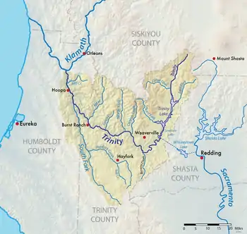 ![]() Map of the Trinity River and Klamath River watersheds. The Trinity River is shown in dark blue, with its watershed highlighted in dark yellow. The South Fork Trinity River extends southward, while the main Trinity River curves east then north. | |