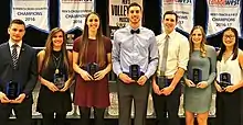 The TWU women's volleyball program joined the Canada West conference and U Sports competition for the 1999–2000 season.[2] The program captured its first U Sports medal in 2010–11, winning bronze. The program would go on to win its first U Sports championship in 2014–15.[37] That season, the program won their first of four Canada West championships, going on to win the conference crown in 2014–15, 2015–16, 2018–19 and 2019–20. Coach Ryan Hofer has led the program since 2006, being named U Sports Coach of the Year once in his career in 2010–11.[38] Individually, the program has produced three Therese Quigley Award winners (Outstanding Student-Athlete) with Rhonda Schmuland winning in 2005–06,[39] and Saralyn Stel winning in 2007–08.[40]