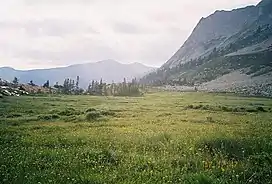 ![]() Tamarack Meadow at 9,500 feet (2,900 m), below Triple Divide Peak, in the backcountry of Sequoia National Park | |