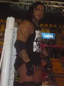 Since their formation in December 2007, Los Psycho Circus (Monster Clown, Murder Clown and Psycho Clown) had not lost a single match, with AAA claiming that their win streak had reached over 600 victories.[31] During the fall of 2010, Los Psycho Circus were engulfed in a war with the many variations of Los Perros del Mal, with Damián 666, Halloween and the group's leader El Hijo del Perro Aguayo being the most prominent Perros during the feud. After several matches between the two groups went to either a no contest or a countout, they were booked to face each other on December 5 at Guerra de Titanes in a steel cage weapons match, where Los Perros del Mal was represented by Damián 666, Halloween and X-Fly.[10][32] In the end of the match, Halloween and Murder Clown were left in the cage, when someone wearing a Monster Clown mask ran out, climbed up the cage and prevented Murder Clown from escaping the cage, dropping him down to the mat and allowing Halloween to escape the cage, handing Los Psycho Circus their first ever loss.[31] After the match, the man unmasked himself to reveal El Hijo del Perro Aguayo, who had been sidelined in October with a knee injury with reports stating that he would have to stay out of the ring for the rest of the year.[31][33] The feud between the two groups continued at March's Rey de Reyes, where Los Perros del Mal, represented by Aguayo, Damián 666, Halloween and Super Crazy, was once again victorious in a match against Los Psycho Circus and Dr. Wagner Jr., the alliance known as Potencia Mundial ("World Power").[16] The feud also spread out to independent promotions International Wrestling Revolution Group (IWRG) and Perros del Mal Producciones (PdM); in IWRG, the groups feuded over the IWRG Intercontinental Trios Championship, which Los Psycho Circus successfully defended against Los Perros, while in PdM, the two groups faced each other in a Masks vs. Hairs steel cage match, which ended with Super Crazy having his hair head shaved off.[34][35] In May 2011, AAA announced that the promotion was going to crown their first ever World Trios Champions and started a tournament with the finals being held at Triplemanía XIX.[36] Los Psycho Circus advanced to the finals by defeating La Maniarquía (Chessman, Silver King and Último Gladiador) and The Black Family (Dark Cuervo, Dark Espíritu and Dark Ozz), while Los Perros del Mal advanced by defeating Real Fuerza Aérea (Aero Star, Argenis and Laredo Kid) and Los Bizarros (Charly Manson, Cibernético and Escoria) to set up a grudge match for the AAA World Trios Championship at Triplemanía XIX.[19][36][37]