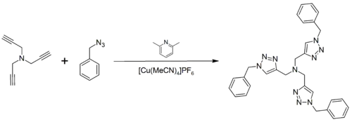 In the literature, it has been gaining widespread use as a biochemical tool for the tagging of proteins and enzymes. The compound is now commercially available through Sigma-Aldrich and Invitrogen. It may be prepared by the click reaction between tripropargylamine and benzyl azide:[1][2]