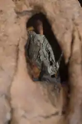 On the evening of 27 May 2013, Blaine Lunstad, an amateur paleontologist, and his wife Michele Lunstad who is of Dutch descent, stumbled upon some bones in the "East Pasture", part of the land of farmer Lige M. Murray, fifty kilometres south of Jordan, Montana. Local fossil hunter Clayton "Dino Cowboy" Phipps confirmed that it was a tyrannosaur skeleton. Rumours of the find reached the BHI, which informed Naturalis. In August 2013, a team of paleontologists from the Naturalis Biodiversity Center, now headed by Anne Schulp, again travelled to the US. From 29 August to 9 September they unearthed a big and remarkably complete Tyrannosaurus rex specimen.[6] The fossil was found in the Hell Creek Formation. The pattern of geomagnetic reversal showed it had an age of at least 67 million years. The excellent preservation had been caused by the skeleton being surrounded by a three metres thick sandstone lens with a high chalk content, neutralising damaging acids.[7] The Black Hills Institute collaborated with the team in the excavation, which was also assisted by Phipps and the Lundstads. On 5 September, paleontologist Philip Manning of the University of Manchester performed a lidar-laserscan of the site surface to precisely determine the position of all bones.[8]