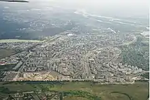 The neighborhood is a large whole-planned bedroom district housing the population of at least 240,000 residents[1] but also includes a small industrial area. Troieshchyna only became part of Kyiv municipality in 1988; prior to that it was a village of Kyiv Oblast which still exists on the edge of the new neighborhood.