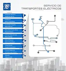 The Mexico City trolleybus system (Spanish: Red de Trolebuses de la Ciudad de México) serves Mexico City, the capital city of Mexico, and is operated by Servicio de Transportes Eléctricos.