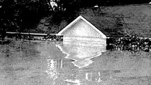 In Lavaca County, unofficial reports indicate that 19.96 in (507 mm) of precipitation fell at Dreyer in a 24-hour period. Severe flash flooding was experienced along many creeks in the northwestern side of the county. A flood wave moving down the Rock Creek caused severe damage to homes in Shiner. Three teenage boys drowned after a home was washed away and demolished. Two other deaths occurred in the city as a few cars attempted to cross the flooded U.S. Route 77A bridge. The Boggy Creek exceeded its banks, severing water and gas lines and washing away the Spoetzl Brewery bridge and nearby homes. Throughout Shiner, many cars and 118 homes were damaged, with several swept away. In Hallettsville, the Lavaca River crested at a record height of 41.2 ft (12.6 m). Fifteen streets were particularly hard hit,[4] with much of downtown being inundated by about 5 ft (1.5 m) of water.[3] A total of 150 to 200 dwellings and 75 businesses were damaged, as were some local government buildings.[4] The basement of the county courthouse was inundated with 8 ft (2.4 m) of water, damaging equipment and furniture, while the jail was flooded up to the second floor,[8] forcing the evacuation of prisoners.[9] City Hall also received water damage.[4] Hundreds of cars were severely damaged or completely ruined. A total of 18 homes in Moulton were damaged. Numerous roads were inundated and 17 bridges were washed away, including a bridge that was over 100 years old. Lavaca County suffered the worst impact from the storm,[4] with damage reaching approximately $35 million.[10]