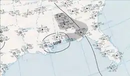In late July, a trough of low pressure, which Hurricane Blanche avoided, was situated over the northeastern Gulf of Mexico.[1] The system developed into Tropical Depression Six at 12:00 UTC on July 28, while located about 60 mi (100 km) southwest of Cape San Blas, Florida.[2] The depression combined with a building high pressure system, resulting in the development of a strong convergence zone. This, in turn, caused heavy rainfall along the Gulf Coast, particularly in southern Alabama and the Florida Panhandle.[1] With sustained winds initially at 25 mph (35 km/h), the storm intensified slightly while tracking west-northwestward. Early on July 29, the depression attained its peak intensity with maximum sustained winds of 35 mph (55 km/h) and a minimum barometric pressure of 1010 mbar (29.83 inHg). Several hours later, it made landfall in a rural area of St. Bernard Parish, Louisiana, with winds of 30 mph (45 km/h). The system curved northwestward and dissipated at 12:00 UTC on July 30, shortly after crossing into Mississippi.[2] The remnants continued into northern Louisiana and then turned northward, before dissipating over Arkansas on August 3.[3]