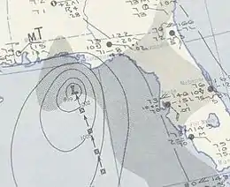 Around the time of the cyclone's naming, reconnaissance aircraft reported winds of around 65 mph (105 km/h), and subsequently Alice executed another loop off the northwest coast of Cuba.[1] Alice weakened quickly to minimal tropical storm status, due to interaction with a cold front off Florida.[3] It deteriorated so much that advisories were discontinued, with Miami Weather Bureau meteorologist James George remarking that "no danger [existed there] whatsoever."[4] After again passing near the Cuban coast, Alice turned to the northwest and began re-strengthening. On June 5, reconnaissance aircraft estimated 70 to 75 mph (110 to 120 km/h) winds in brief squalls northeast of the center, along with a pressure of 997 hectopascals (29.4 inHg); this would be its peak intensity. The storm again weakened as it approached the Florida peninsula, and Alice made landfall just west of Panama City Beach on June 6 as a minimal tropical storm. It dissipated shortly thereafter.[1]