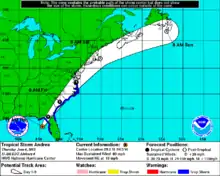 ![]() Tropical Storm Andrea at peak intensity, while approaching Florida on June 6 | |