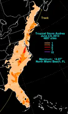 - David M. Roth (July 5, 2013). Tropical Storm Andrea June 4-8, 2013. Weather Prediction Center (Report). College Park, Maryland: National Oceanic and Atmospheric Administration. Retrieved February 27, 2014.