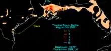 The storm dropped heavy rainfall in Louisiana, which peaked at 10.25 inches in Norwood. Storm tides were generally 1 to 2 feet (.3 to .6 m) above normal, while the mouth of the Bayou Dupre recorded a storm tide of 3.79 feet (1.16 m).[2] The rainfall led to flash flooding in places, and also a few overflowed rivers in St. Tammany Parish.[13] The flooding covered several roadways[14] and bridges, and entered a few businesses and houses in East Feliciana Parish.[15] Damage in Louisiana totaled to $150,000 (2002 USD, $180,000 2008 USD).[13][14][15][16]