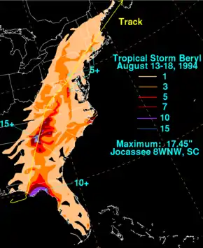- David M. Roth. "Tropical Storm Beryl — August 14–18, 1994". Tropical Cyclone Point Maxima. Weather Prediction Center. United States National Oceanic and Atmospheric Administration's National Weather Service. Retrieved July 2, 2017.