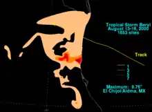 The tropical depression traveled to the northwest across the southwest Gulf of Mexico.[1] It strengthened rapidly, and there was evidence of deep convection as it passed over warm waters.[3] It was upgraded to Tropical Storm Beryl late on August 14 with surface winds of 50 mph (85 km/h), based on reconnaissance aircraft observation.[1] Six hours later, the storm accelerated to near 9 mph (15 km/h), meaning that landfall would happen sooner than expected, preventing the time for Beryl to strengthen to a hurricane.[4] However, Beryl failed to undergo significant intensification as was forecast, as it maintained an intensity of 50 mph (85 km/h). The lack of intensification could be due to moderate wind shear and entrainment over the Gulf of Mexico. Tropical Storm Beryl continued to track to the northwest toward the Rio Grande Valley area in the southern portion of the U.S. state of Texas. The storm made landfall early on August 15 along the Mexican coast about 105 mi (165 km) south of Brownsville, Texas, 35 mi (55 km) north La Pesca, Tamaulipas[1] and about 115 mi (185 km) north of Tampico. Beryl was downgraded to a tropical depression about five hours after landfall.[1] The Brownsville radar showed that the circulation center of the storm became elongated parallel to the mountain ranges of northeastern Mexico, so the system was no longer declared a tropical depression late on August 15,[5] while located near Monterrey.[1]