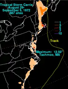 Tropical Storm Carrie was a strong tropical storm that affected the East Coast of the United States in early September 1972. The third tropical cyclone of the 1972 Atlantic hurricane season, Carrie formed on August 29 from a complex sequence of meteorological events starting with the emergence of a tropical wave into the Atlantic in the middle of August. Tracking generally northward throughout its life, Carrie reached an initial peak intensity as a moderate tropical storm before nearly weakening back into tropical depression status. The storm began to reintensify in a baroclinic environment after turning toward the northwest; its winds of 70 miles per hour (110 km/h) as it was transitioning into an extratropical system eclipsed the cyclone's previous maximum strength. The extratropical remnants of Carrie skirted eastern New England before making landfall in Maine on September 4 and dissipating over the Gulf of Saint Lawrence during the next two days.