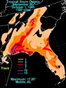 Tropical Storm Debbie of the 1965 Atlantic hurricane season broke the daily rainfall record in Mobile, Alabama, despite dissipating offshore. It developed on September 24 in the western Caribbean Sea, and moved northwestward for several days without intensifying. On September 27, Debbie turned toward the northeast in the Gulf of Mexico, and the next day briefly attained tropical storm status. However, the intrusion of cooler air imparted weakening, and the storm dissipated on September 30 just off the east coast of Louisiana. It initially threatened areas of Louisiana that sustained significant damage from Hurricane Betsy in early September, although Debbie only caused light rainfall and some flooding in the state. In southern Alabama, the storm dropped 17.2 in (440 mm) of rainfall, which resulted in significant flooding of roads and cars. Damage totaled $25 million in the Mobile, Alabama area, although there was little damage elsewhere.