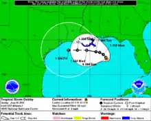 Becoming a tropical storm on June 23, Debby became the earliest fourth named storm in the Atlantic basin, surpassing the old record set by Hurricane Dennis on July 5, 2005, however with 2016's Danielle the record was beaten by three days. Initially, Debby was predicted to curve westward and potentially threaten Texas.[2] A deepening trough would curve the storm westward, while wind shear was predicted to decrease.[3] Although the storm generated very cold cloud tops, much of the convection was located more than 100 miles (160 km) from the center and still displaced to the east.[4] By 1200 UTC on June 24, the forecast path was shifted from east-central Texas to southeastern Louisiana.[5] Despite persistent wind shear, Debby was strengthening and around that time, the storm attained its maximum sustained wind speed of 65 mph (100 km/h).[1] Later on June 24, the National Hurricane Center noted in its next advisory that this "is a very difficult and highly uncertain forecast", citing Debby's slow movement and widespread computer forecast models.[6]