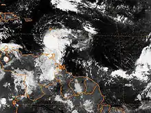 Tropical Storm Jerry was a short-lived tropical storm that formed in the latter half of the 2001 Atlantic hurricane season. Forming as a tropical depression from a tropical wave on October 6 near Barbados, Jerry intensified into a tropical storm early the following day on October 7 while initially located under an environment of weak vertical wind shear.[1] After reaching its peak of 50 mph (80 km/h), Jerry passed just south of Barbados late on October 7 and through the Windward Islands on October 8. Shortly after entering the eastern Caribbean Sea, moderate upper-level wind shear affected Jerry's upper-level outflow, and the cyclone weakened to a depression shortly afterwards. Deterioration in organization continued, and Jerry dissipated while moving rapidly westward well south of Puerto Rico. Jerry caused minimal effects in the Lesser Antilles.