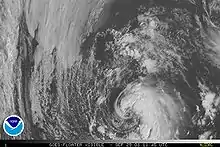 During the afternoon, satellites revealed that Laura had developed a deep warm core, a characteristic of a tropical cyclone, but the wind field remained subtropical in nature.[5] By the nighttime hours, the radius of the strongest winds contracted to 80 mi (130 km), much smaller than what is typical of a subtropical cyclone. However, Laura was still under the influence of an upper-level low and cloud tops remained shallow.[6] However, the cloud tops became colder overnight and Laura was on the verge of becoming a tropical cyclone by the morning of September 30, but strong interaction with the upper-level low meant it was still subtropical.[7] Despite moving over colder waters, a water vapor satellite image determined that Laura had separated itself from the upper-level low, signifying it had developed into a tropical cyclone. Laura was re-classified as a tropical storm at a relatively high latitude,[8] 40.6°N.[1] Laura peaked as a tropical cyclone, attaining maximum 1-minute sustained winds of 60 mph (95 km/h) and a minimum central pressure of 994 millibars (29.4 inHg).[1] Not long after being declared tropical, early signs of an extratropical transition appeared. Cold air began to enter the storm on the west side and forecast models showed Laura becoming extratropical the next morning and non-tropical later the next day.[9]